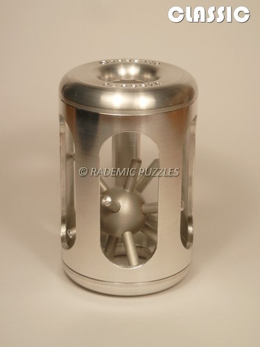 hlavolam má kovově lesklý povrch klece, zátka a ježek uvnitř mají kovově